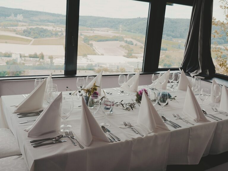 Nach der Trauung empfangen Sie Ihre Gäste auf der Burgterasse mit Blick über das romantische Neckartal zum Sekt mit Canapés und anschließend mit Kaffee und Kuchen.
