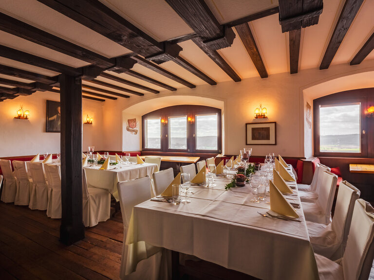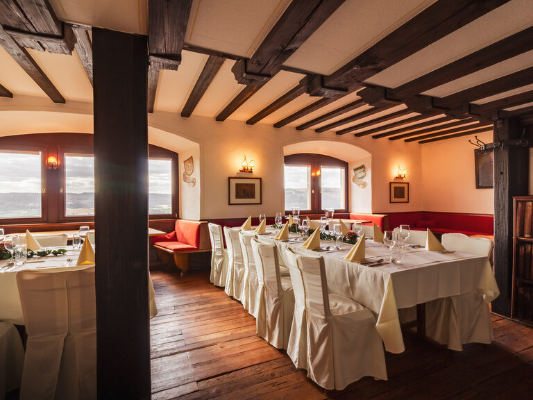 Die stilvolle Götzenstube für bis zu 50 Personen mit ihrem besonderen Charme bietet als weiterer Raum den perfekten Rahmen für Ihre Hochzeit auf der Burg.