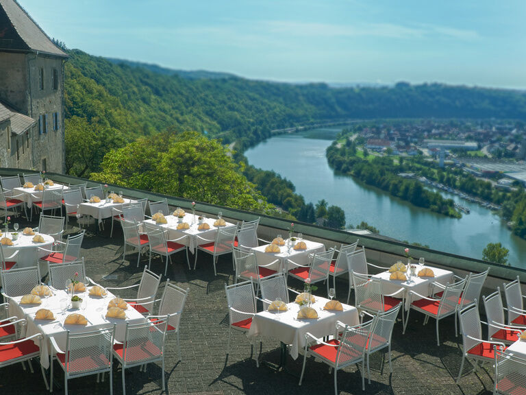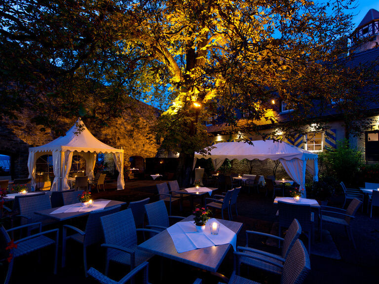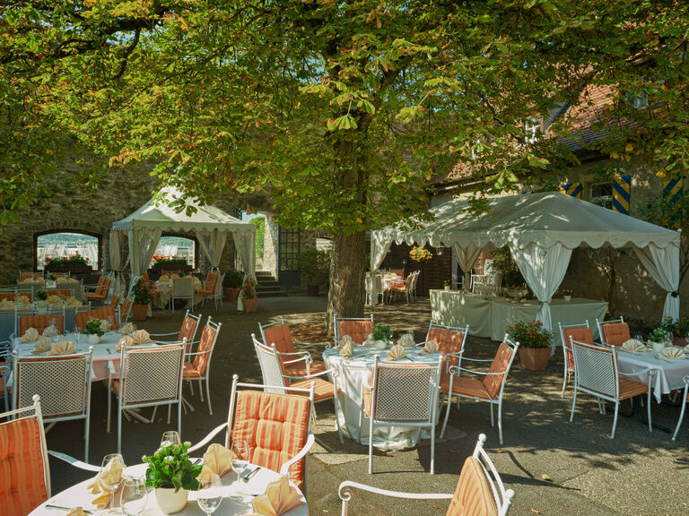 Recover and rest during the summer months while enjoying delicacies from cuisine and wine cellar in the inner ward under the old chestnut.